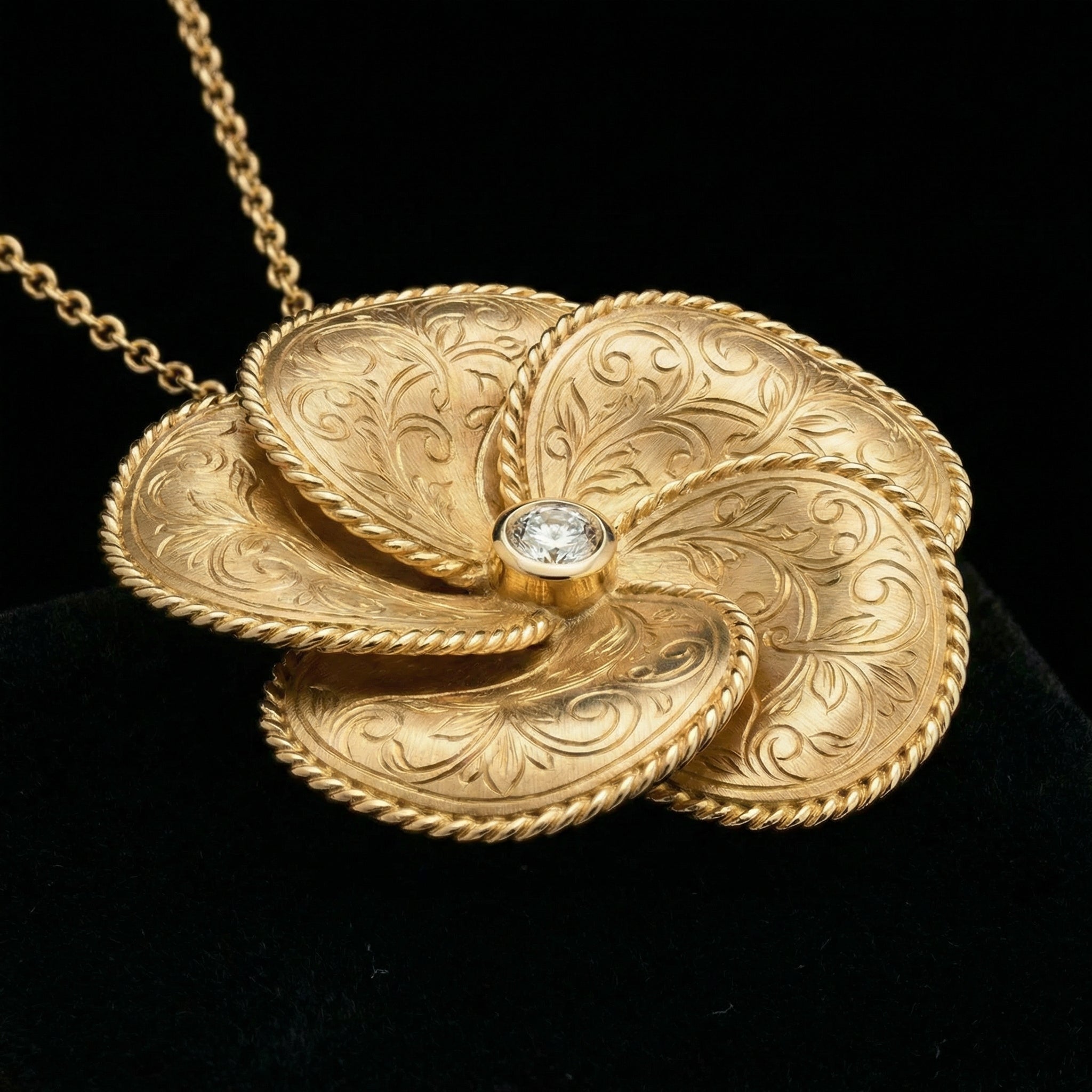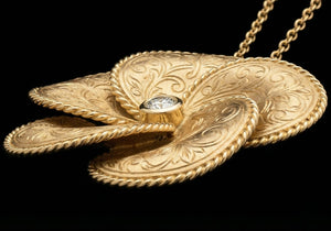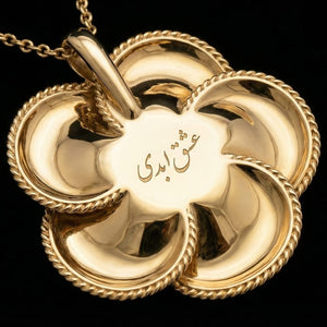 I designed this pendant to capture the timeless beauty of Persian paradise gardens in 18ct yellow gold. The rose motif translates floral tilework from Iran's garden palaces into wearable sculpture.