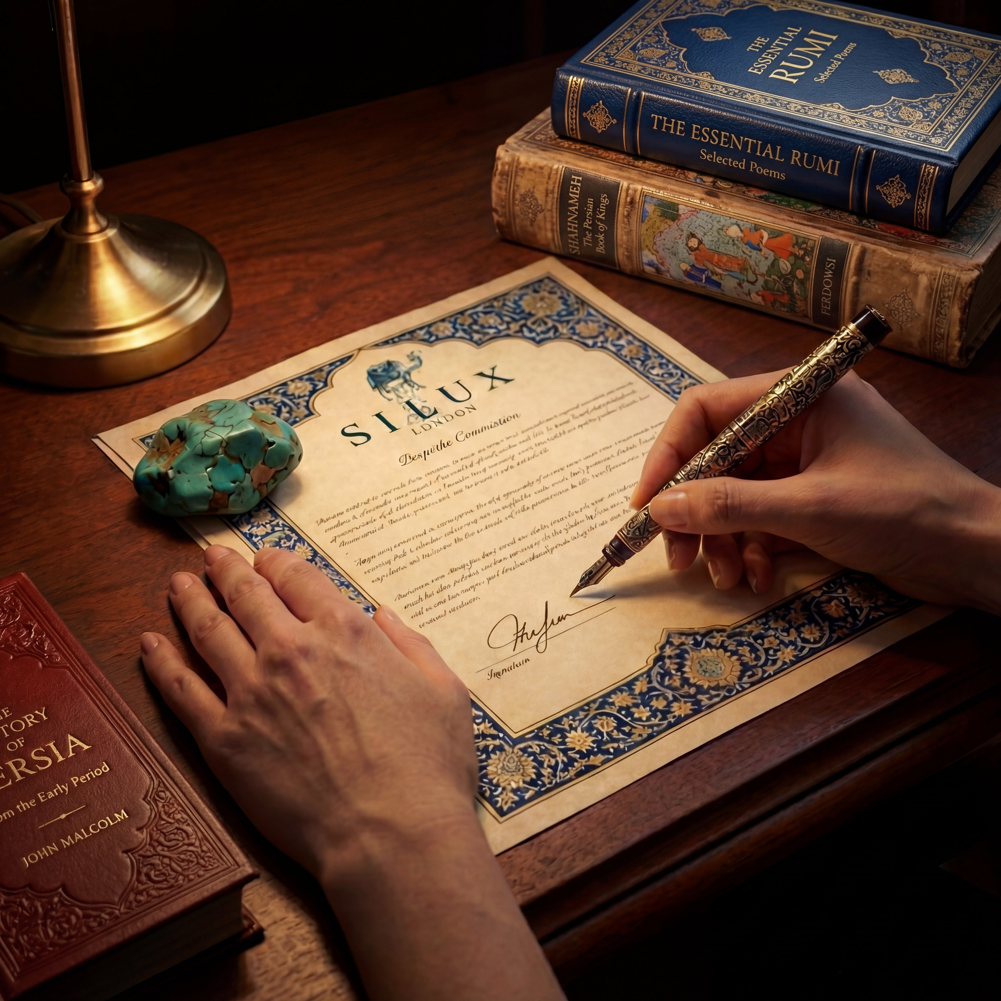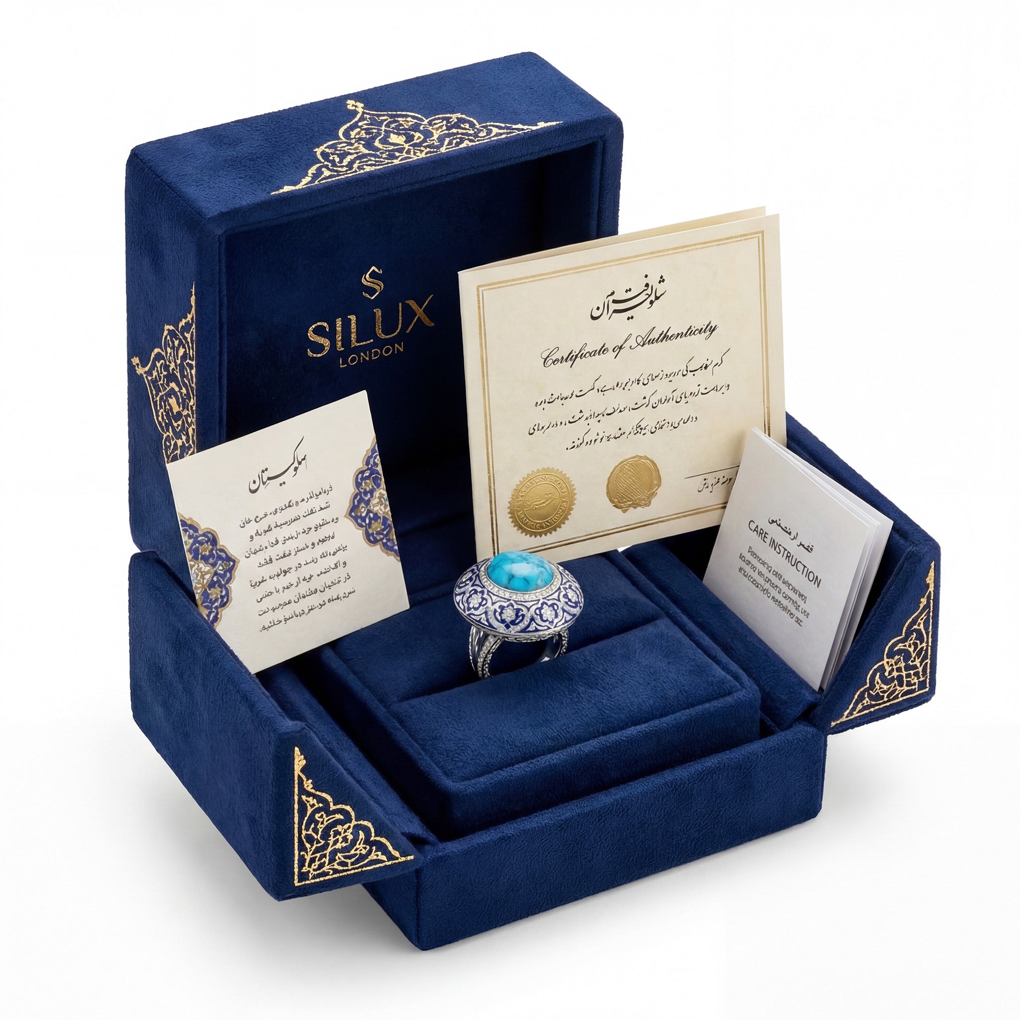 You receive photographs of your completed piece for approval. Upon final payment (remaining 50%), your jewellery is dispatched in premium Silux London packaging with your Certificate of Authenticity, Persian heritage story card, care instructions, and a handwritten note.