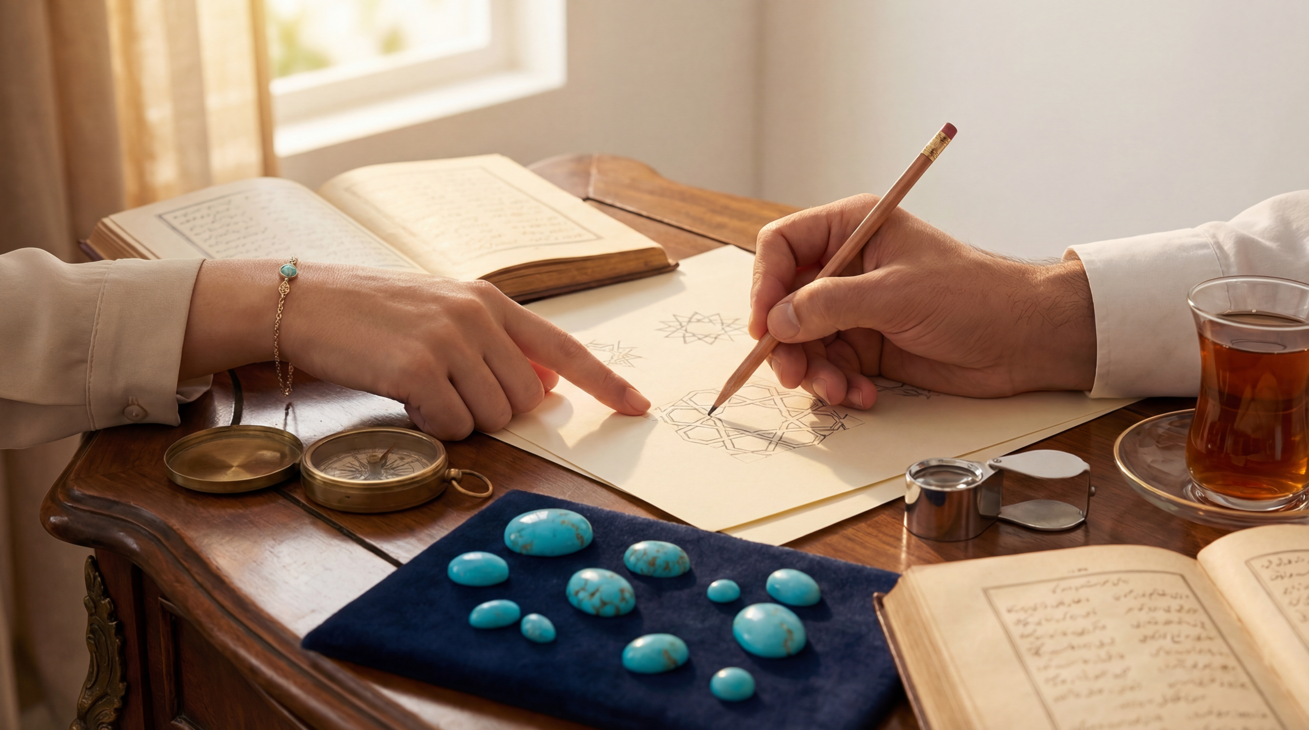 Based on our consultation, I prepare a detailed design proposal including initial sketches, Persian cultural references and symbolism, material options with provenance details, and a price estimate across different specifications.