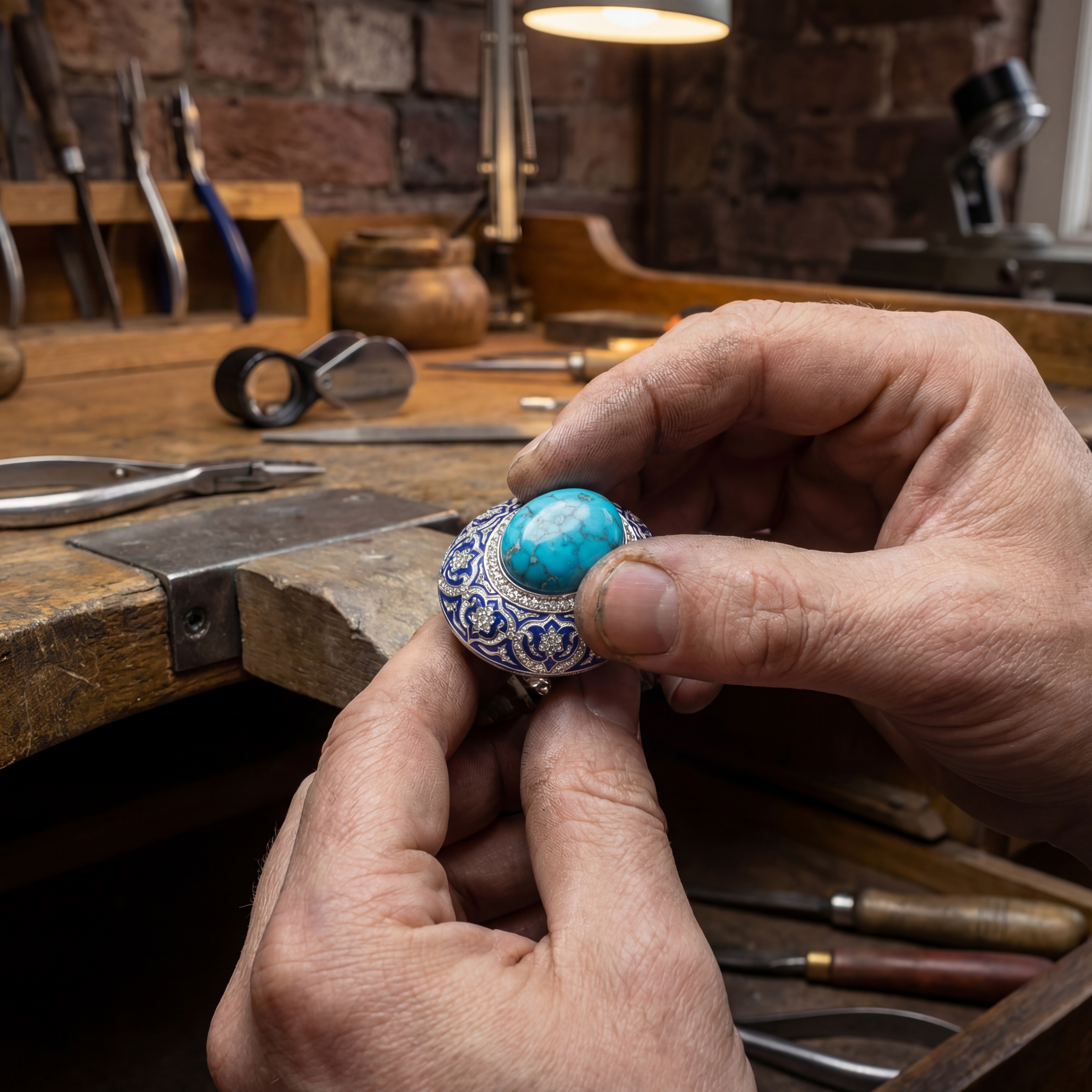 Metal casting or fabrication, stone setting, Persian turquoise installation (if applicable), finishing and polishing, and UK hallmarking at Birmingham Assay Office.